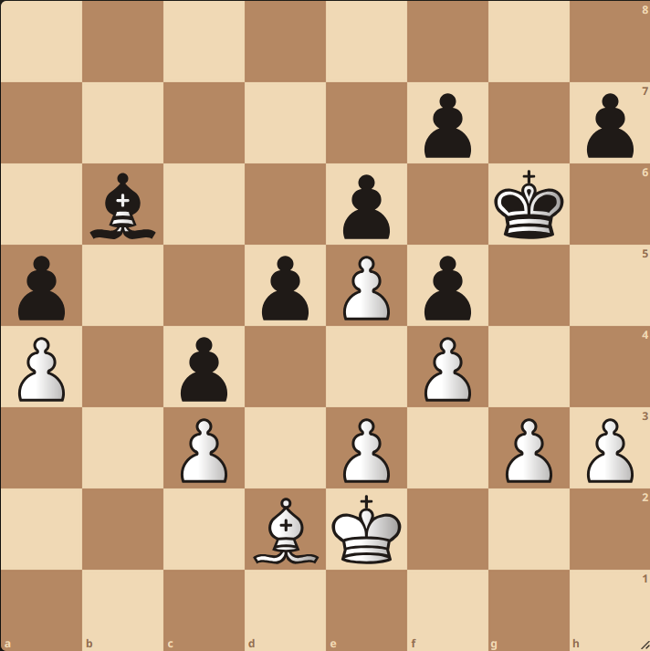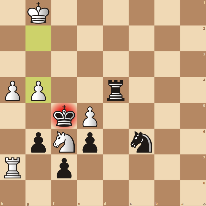 Hier slaat zwart op e5, wat de boel gelijk houdt, maar de koning naar voren bewegen naar f4 geeft juist groot voordeel: er komen opeens matbeelden in via Kg3 en e5 valt wel via het paard, en omdat het paard op e5 ook f7 aanvalt zitten er geen aftrekschaakjes met voordeel in. Lastig te zien, maar een mooi voorbeeld van hoe roven niet altijd handig is. Ook dit was nog niet fataal, maar een stuk in de aanbieding doen een zet of 5 later echter wel… 2.5 – 3.5.