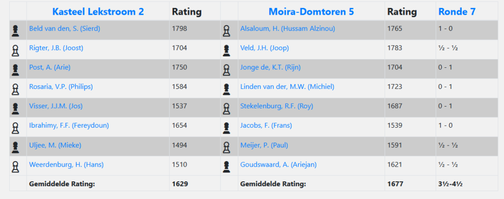 In de wat-eigenlijk-de-laatste-ronde-zou-moeten-zijn-geweest speelde Kasteel Lekstroom 2 tegen Moira Domtoren 5. Toch wat dichterbij voor de uitploeg dan een Barendrecht of een Krimpen. Scheelt in de reistijd, en ook in de kansen om onderweg in de problemen te komen met files. Na een minuut stilte voor de overleden Jan Timman begon de wedstrijd op de 64 velden van de acht borden.