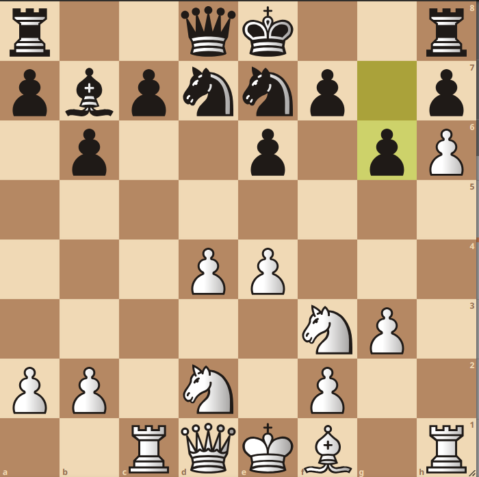 We komen erin na zet 13 van zwart. Wit heeft het centrum en een mooie h6 pion. Het zwarte paard op e7 is daar overigens via f6-d5-f4-g6 gekomen.