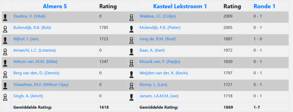 Het zou een belangrijke wedstrijd worden. Niet zozeer op grond van de speelsterkte van de tegenstander, maar als testcase dat we ons aan afspraken gaan houden. Vorig jaar was Kasteel Lekstroom 1 misschien ook wel het sterkste team in zijn klasse, maar toch liep het tegen twee 3.5-4.5 nederlagen aan en de vraag was of dit nu echt nodig was geweest. Daarom hadden we voor dit jaar duidelijke afspraken gemaakt over praktische zaken, zoals trainingssessies bijwonen, tijdig afmelden bij de teamcaptain, op tijd in de speelzaal zijn, partijen nabespreken, de rol van de teamleider bij een remise-aanbod, etc.